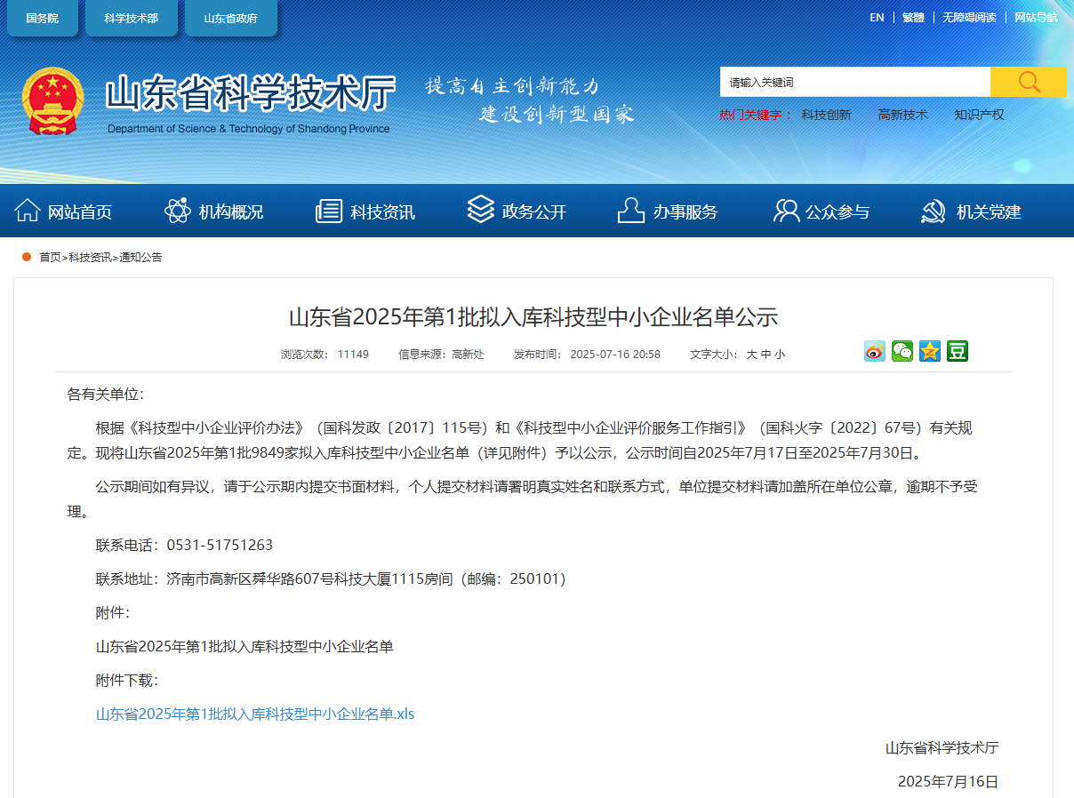 2025年7月16日,山東省科學技術(shù)廳公示了《山東省2025年第1批擬入庫科技型中小企業(yè)名單》,7月30日公示期結(jié)束后,淄博市碳生態(tài)發(fā)展集團有限公司成功入選山東省2025年度科技型中小企業(yè)名單。這是市碳生態(tài)發(fā)展集團繼2024年首次獲評后,2025年再次獲得這一省級榮譽。